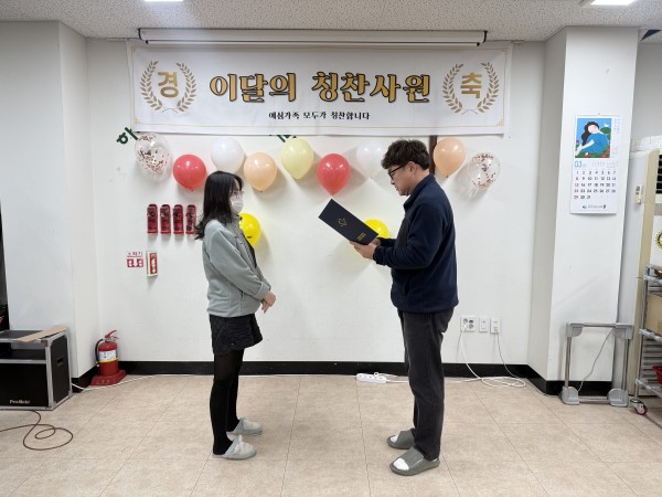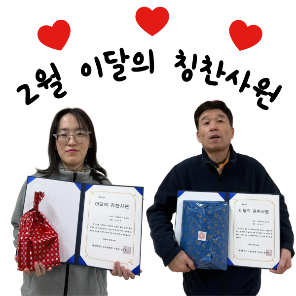 2026년 3월 6일 금요일, 예심하우스에서 근로자의 모범적인 태도와 성실한 근무 자세를 격려하기 위해 2월 칭찬사원 시상식을 진행하였습니다.